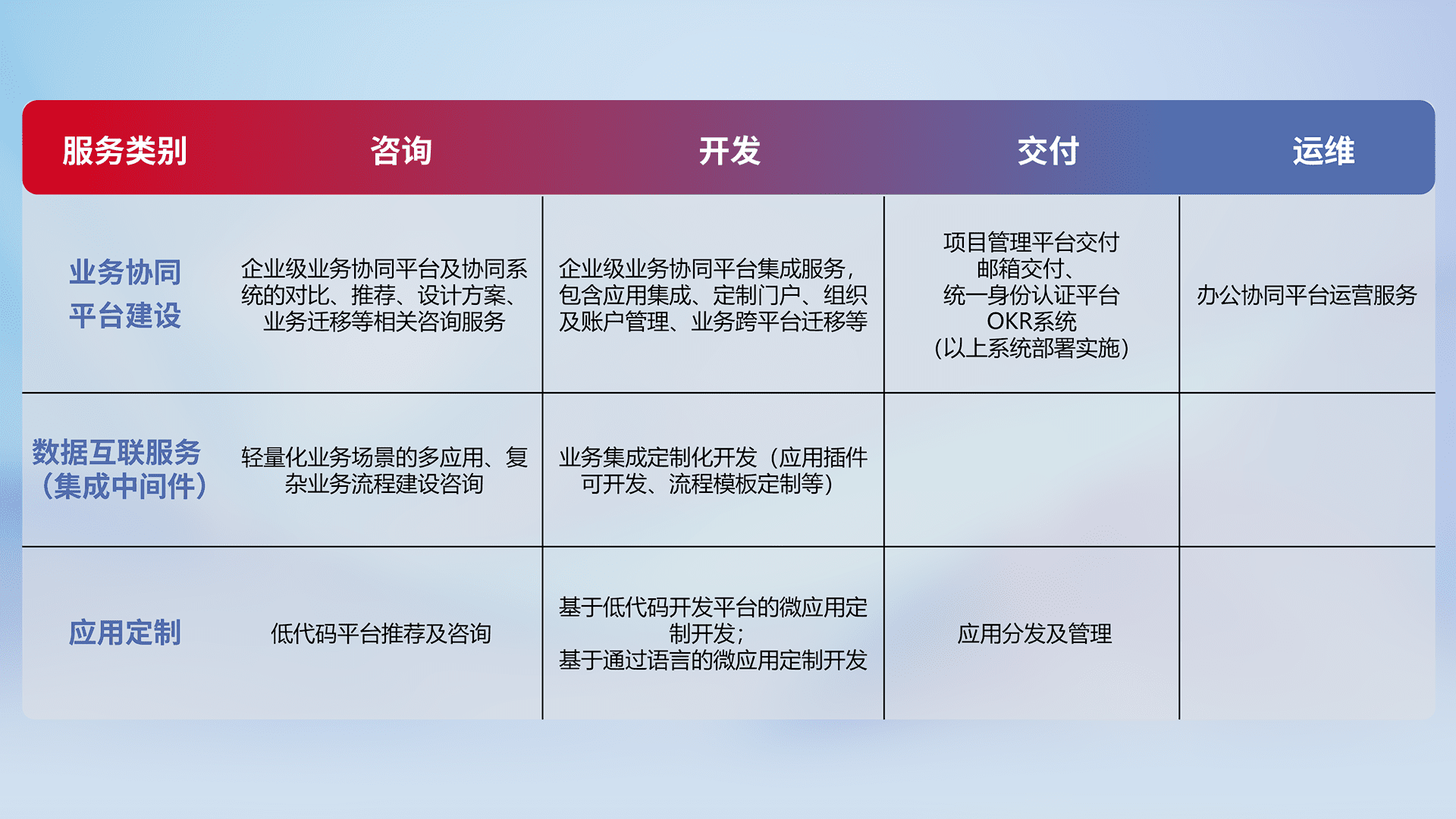 针对钉钉、、企微、、IDaas等平台级产品提供产品的规划、、、、方案、、、、交付、、、定制化开发等服务,,实现如统一协同办公、、、智能客户服务、、、混合会议管理、、、、智能数据查询、、、等业务场景,,,,实现数字化转型。。。